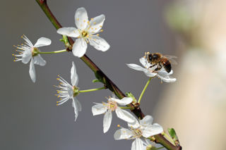 Honey bees make honey from pollen and nectar collected from flowers. They live in large colonies with one queen, many sterile female workers and some male drones. In the wild, honey bees nest in hollow trees. Honey bees are very important flower pollinators. They fly astonishingly far distances to collect pollen; on average 2-3 miles from their hive.
